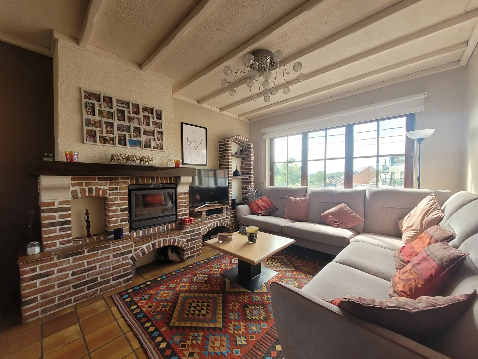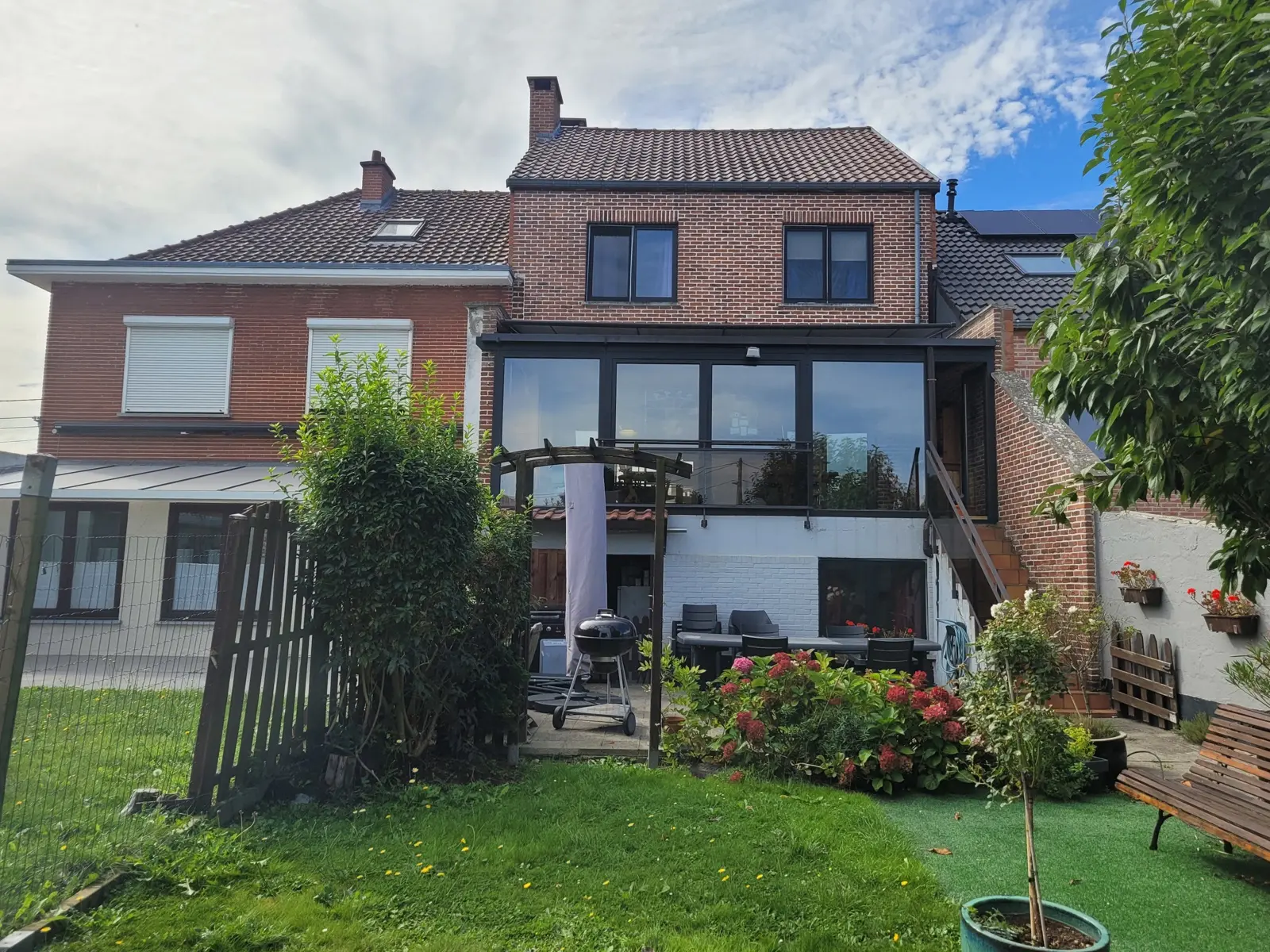 Au 1er étage : hall avec wc séparé, lumineux living avec cassette au bois, cuisine équipée, véranda de 20 m2, accès au jardin.