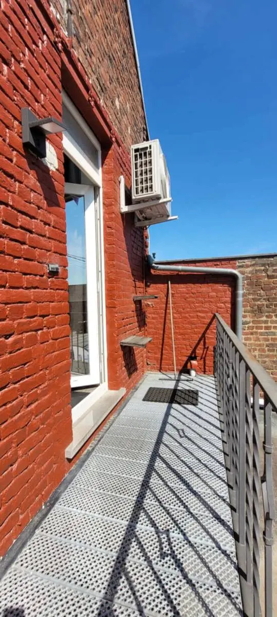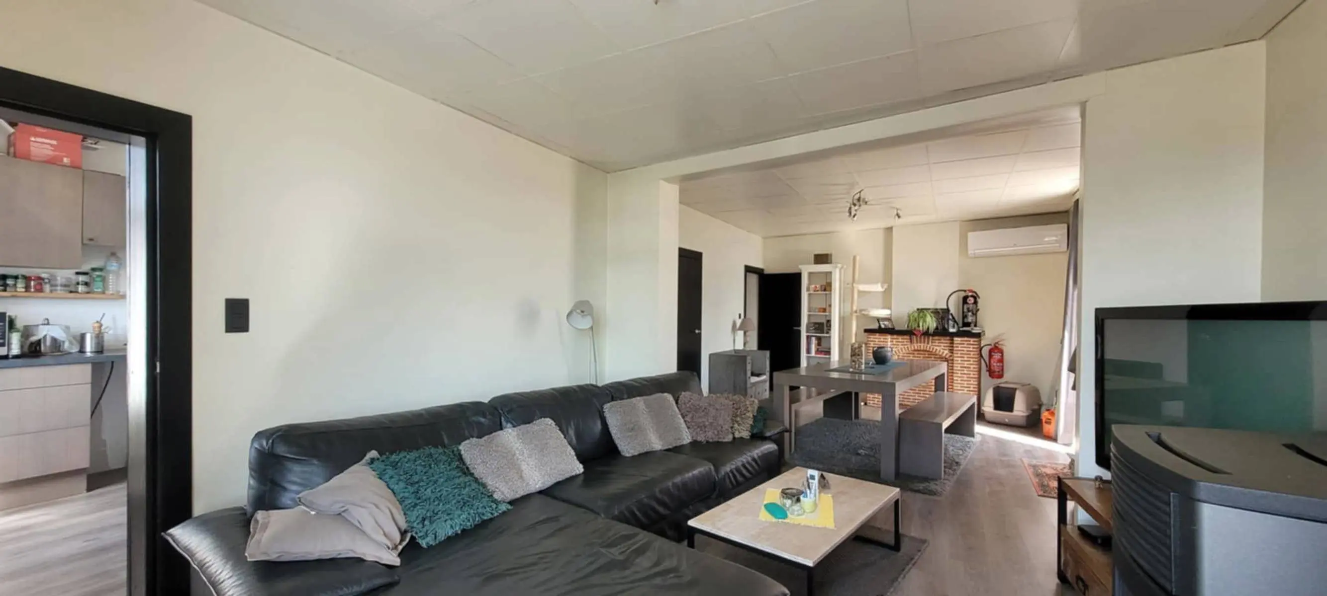 A l'étage (appartement) : living avec feu à pellets et air conditionné, cuisine semi-équipée, débarras, salle de bains avec wc, 2 chambres de 16 m2 chacune.