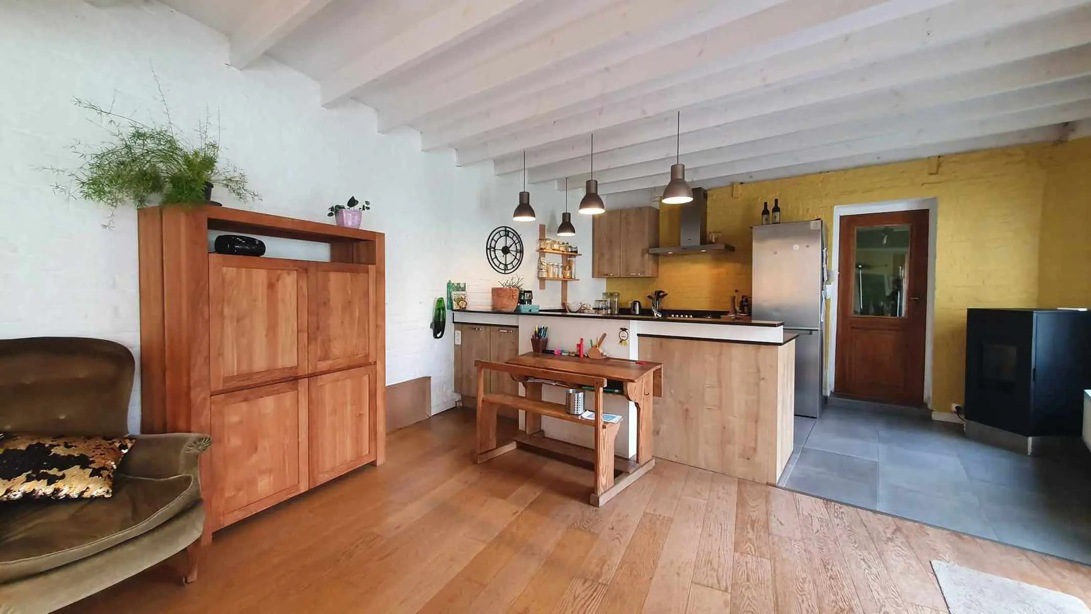 Châssis PVC double vitrage - Chauffage central gaz avec chaudière à condensation + feu à pellets et feu au bois- 12 panneaux photovoltaïques - Installation électrique neuve et conforme - Toitures neuves avec isolation - Isolation complète de la façade arrière - RC net : 1450 euros - Excellent PEB : B 158 kWh/m2/an
