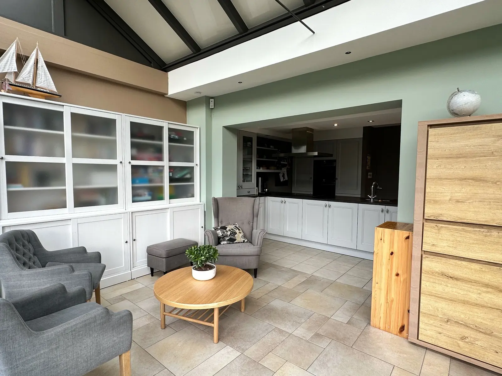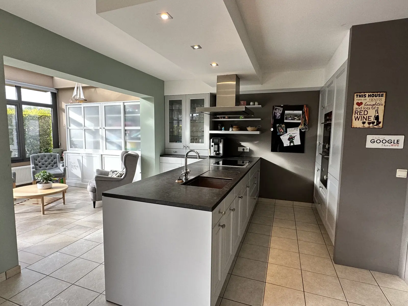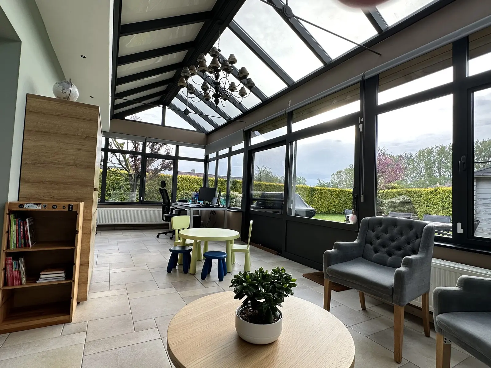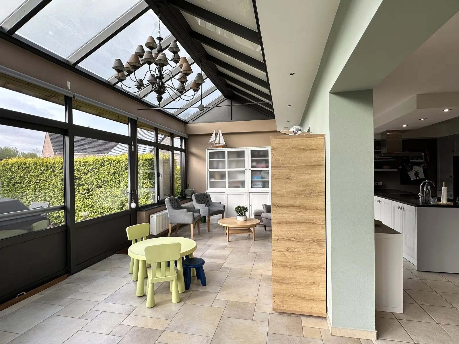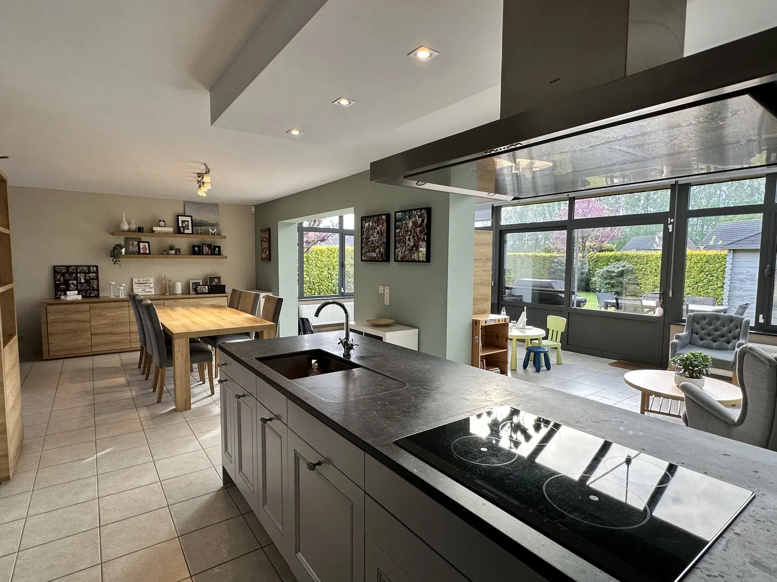 Voici sa composition : au rez-de-chaussée : hall d'entrée avec wc séparé, lumineux living, cuisine ouverte équipée, véranda avec accès au jardin et à la terrasse, garage avec espace buanderie.